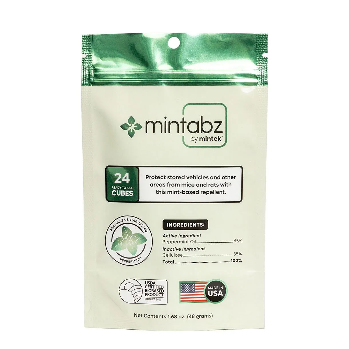 Protect your small spaces from pests naturally with Mintabz™, Mintek’s peppermint oil deterrent. Skip the mess of manually dosing cotton—our pre-dosed Mintabz cubes, infused with peppermint oil, offer a fast, simple, and effective natural deterrent. Simply place as many cubes as desired in hard-to-reach places or potential entry points for mice, rodents, or rats and allow Mintabz to release a strong minty smell. Rodents dislike peppermint’s powerful odor and stay away from places where it’s present. Enjoy peace of mind with Mintek’s reliable, natural defense, safeguarding everything from your vehicle wiring to your outdoor equipment, gardens, and AC unit. Mintek Mintabz are a USDA Certified Biobased Product.