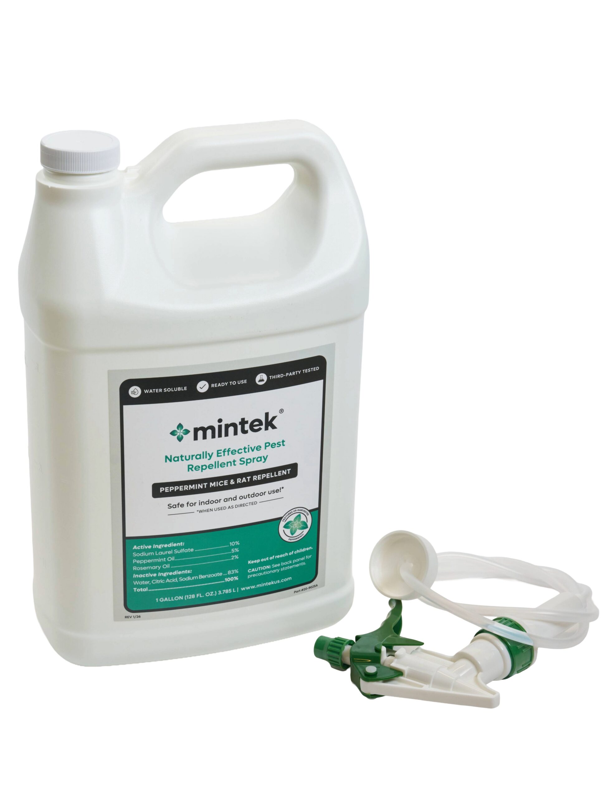 With Mintek’s one gallon bottle, you can easily coat pest-ridden areas with a water-soluble, natural peppermint and rosemary repellent. This is our largest spray bottle with attached hose and non-aerosol trigger sprayer. Holds 128 ounces of safe and effective repellent with the convenience of a hose attachment. This spray bottle allows adjustable delivery to cover a large area of hard-to-reach or high-traffic areas precisely and directly. Rodents dislike rosmary and peppermint’s powerful odors and stay away from places where these scents are present. Mintek Spray is a USDA Certified Biobased Product.